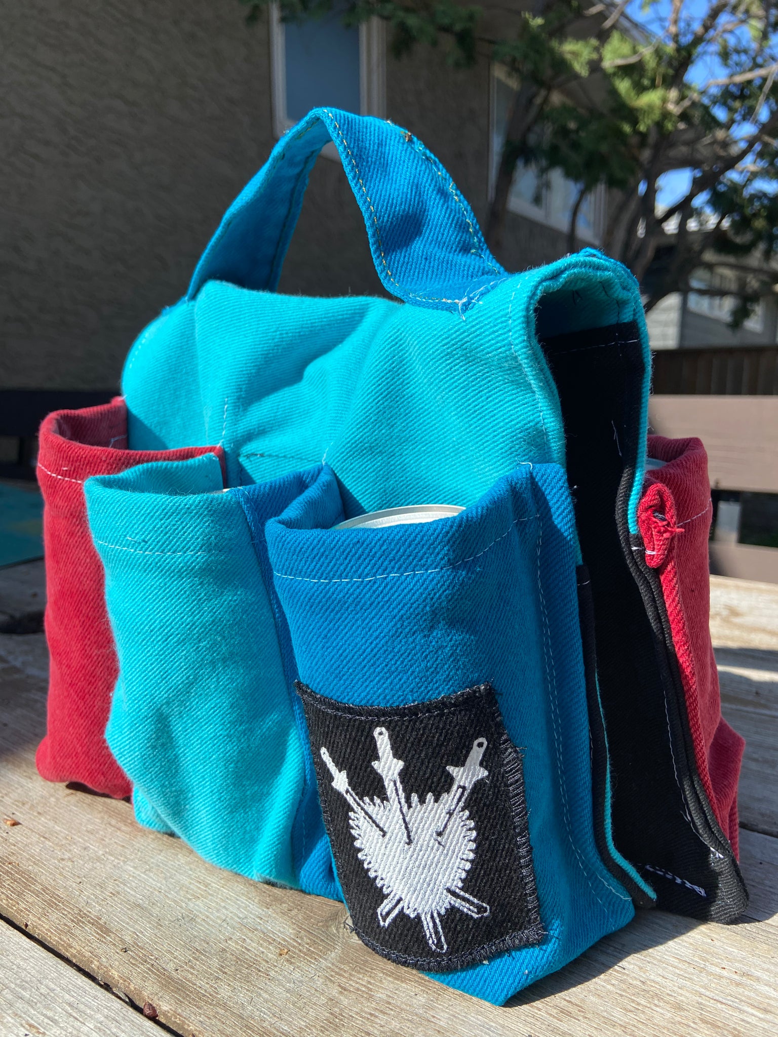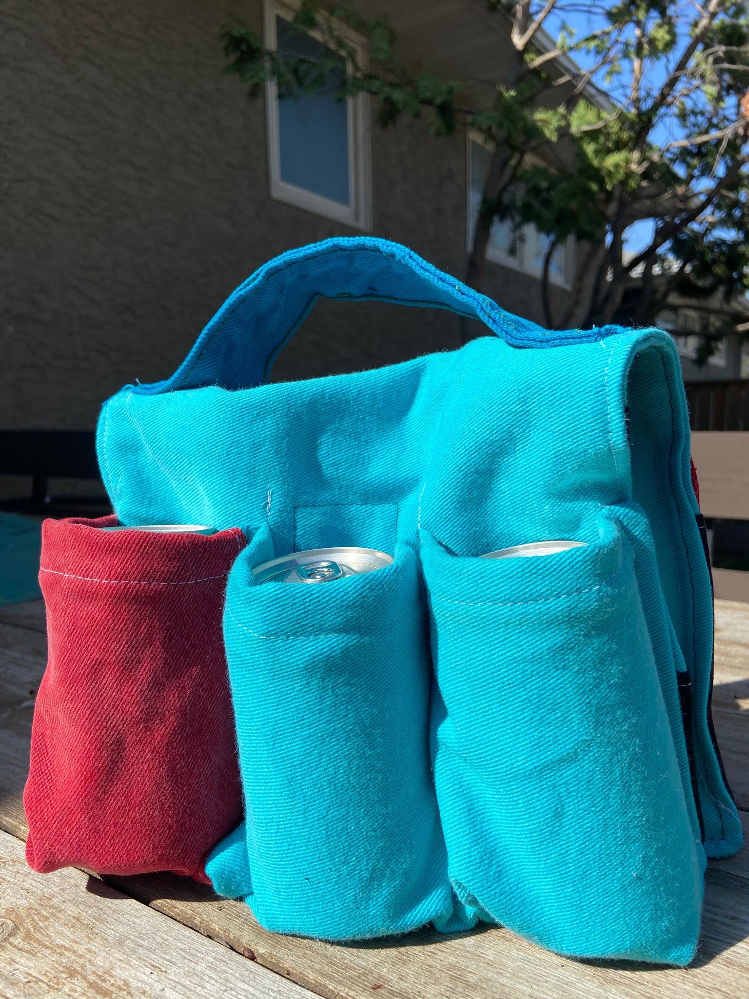 Six pack drink holder for your bicycle with handle for easy transfer from bike to party or picnic. Made entirely of recycled denim and flannel for extra insulation. Hidden velcro to secure it while you ride.