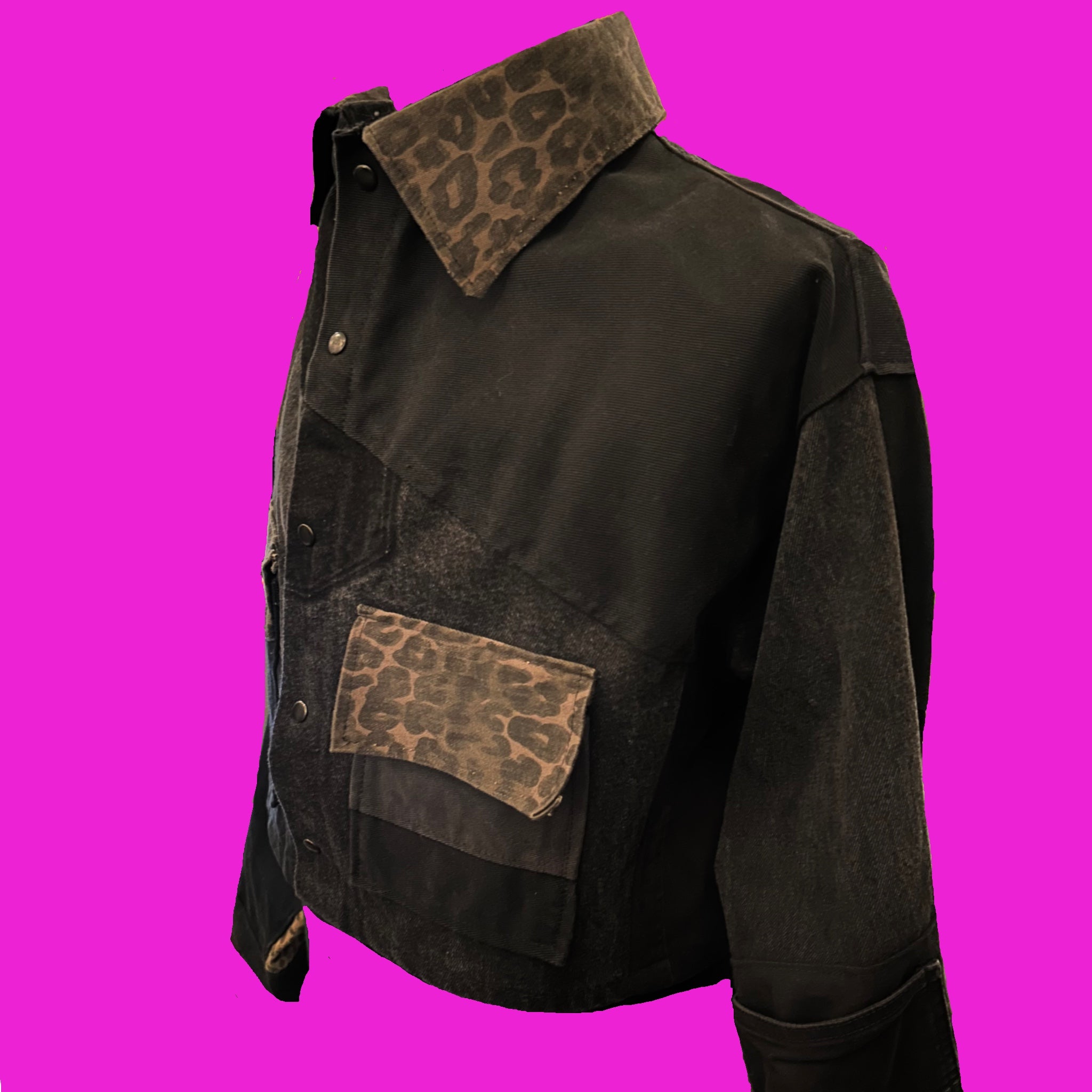 Standard issue, drop shoulder, XL, one size fits most, extra long sleeve crop jacket with two large cargo pockets. Made with upcycled denim. Made to be extra roomy for layering with all of your hoodies and sweaters. Snap front. Crop length.